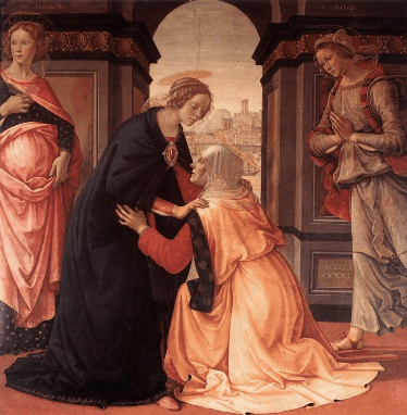 エリサベトがマリアの挨拶を聞いた時、まだエリサベトのお腹の中にいるバプテスマのヨハネが、喜び踊ります。そしてマリアを迎えたエリサベトが、祝福された女性としてマリアを讃え、さらにマリアの胎に宿る子を「わたしの主」と呼びます。