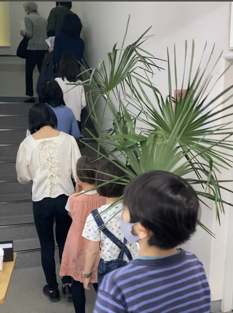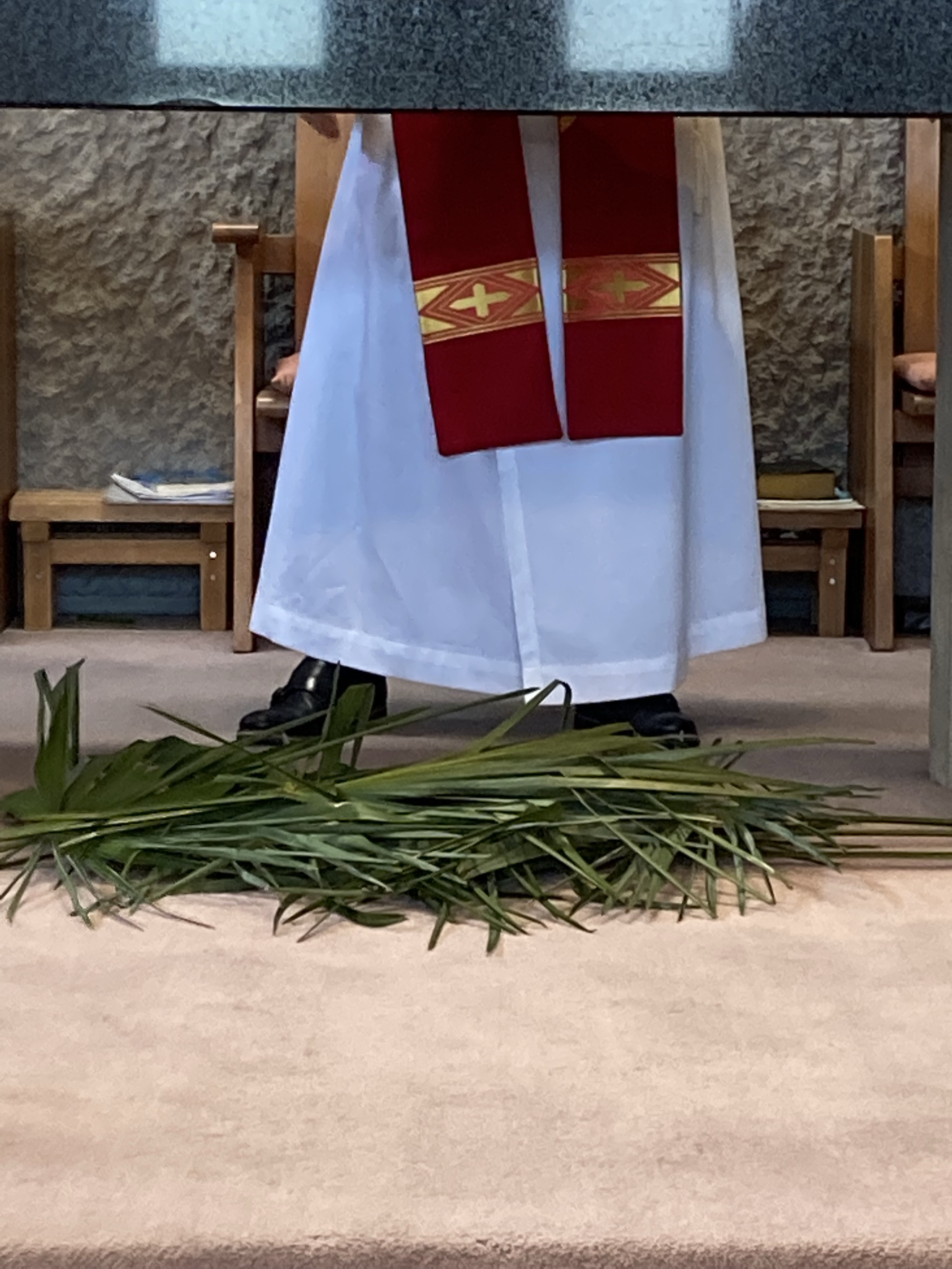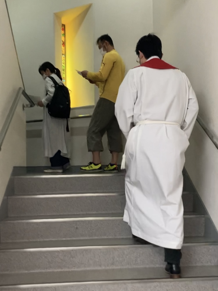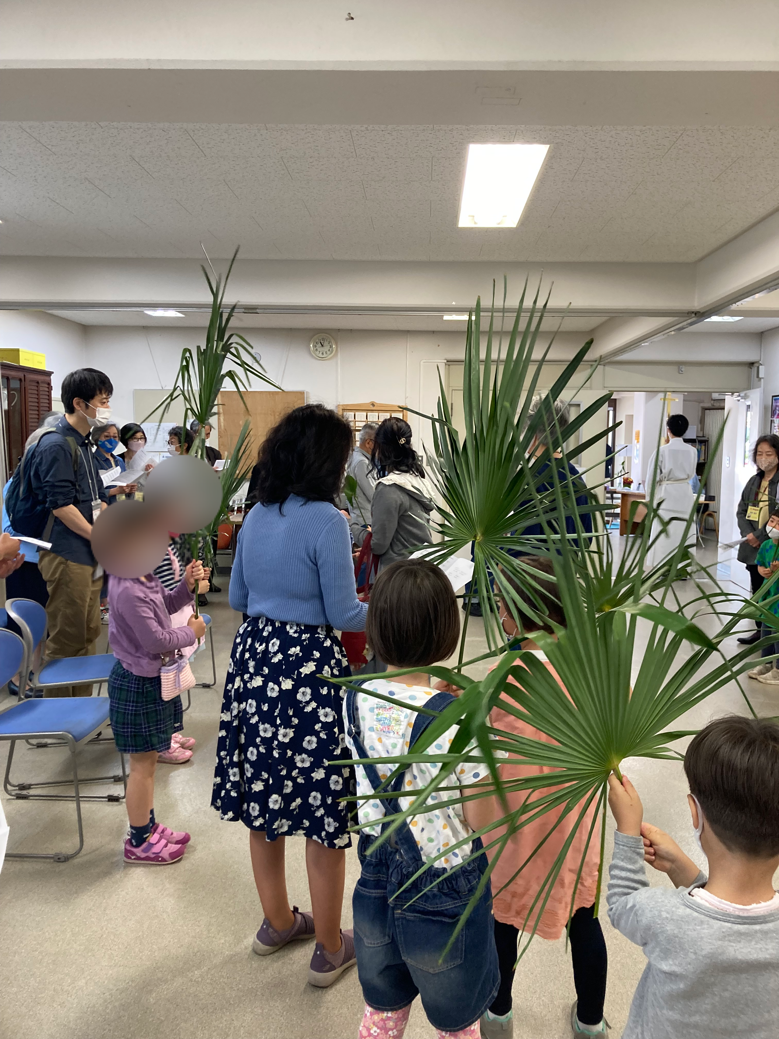 聖マーガレット教会では例年、11時からの聖餐式の前に、教会の1階ホールに集まります。そして、一人ひとりが棕櫚の葉や棕櫚の十字架を手に持って、讃美しながら2階の聖堂に上がって行きます。